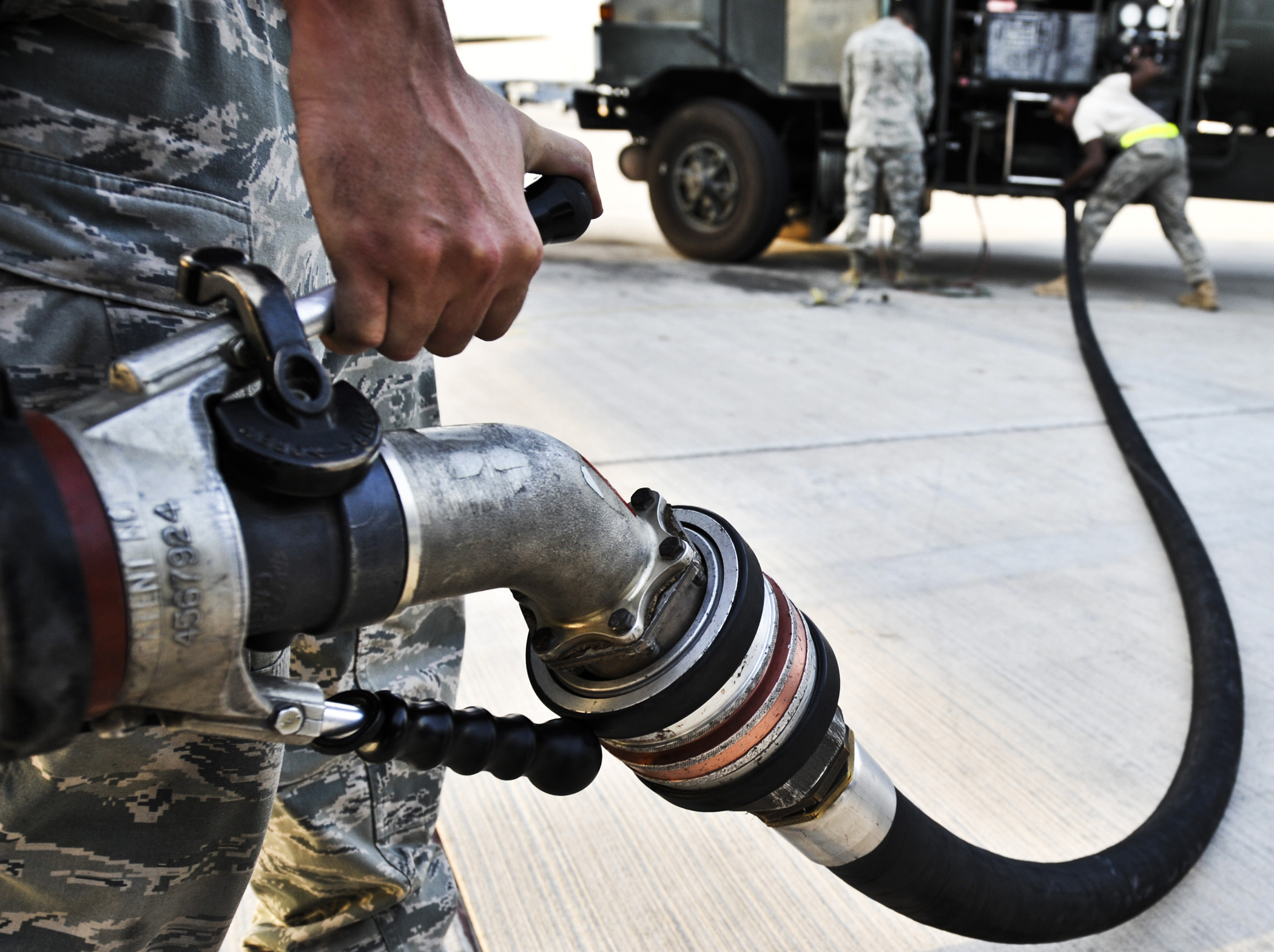 Airmen from the 340th Expeditionary Aircraft Maintenance Unit and 379th Expeditionary Logistics Readiness Squadron retract a refueling hose July 31, 2011, in Southwest Asia. (U.S. Air Force photo/Senior Airman Paul Labbe)